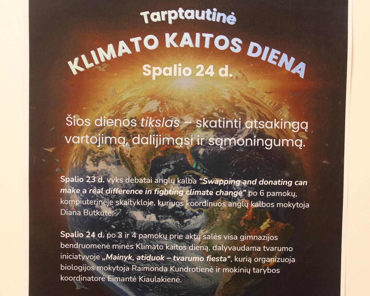 Spalio 24 d. Gargždų „Vaivorykštės“ gimnazijos bendruomenė vieningai minėjo Klimato kaitos dieną, prisijungdama prie Aplinkos ministerijos rengtos septintosios Klimato savaitės. Šia proga mokykloje surengta tvarumo iniciatyva „Mainyk, atiduok – tvarumo fiesta“, kurios tikslas – skatinti atsakingą vartojimą, dalijimąsi ir sąmoningą požiūrį į mus supančią aplinką.