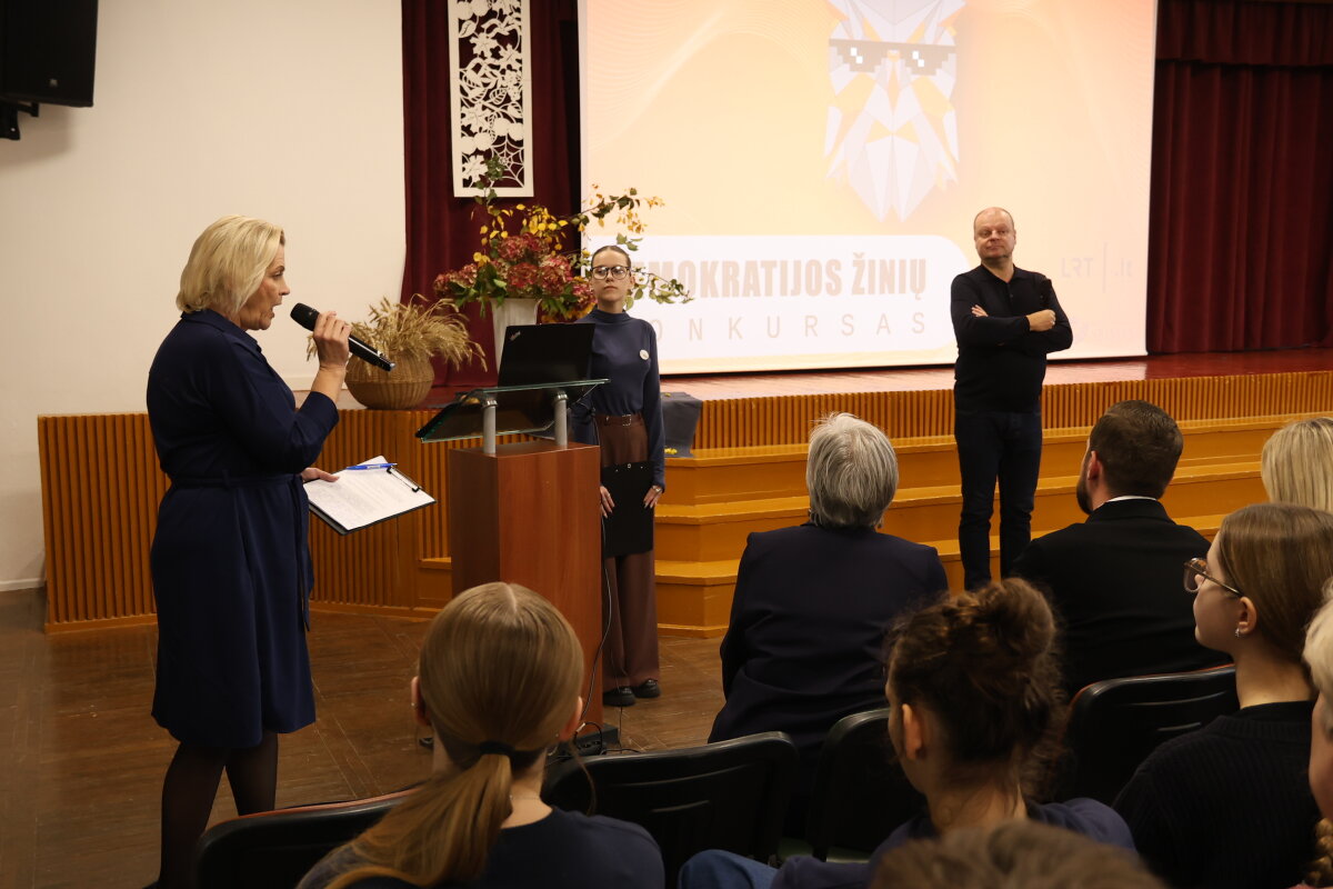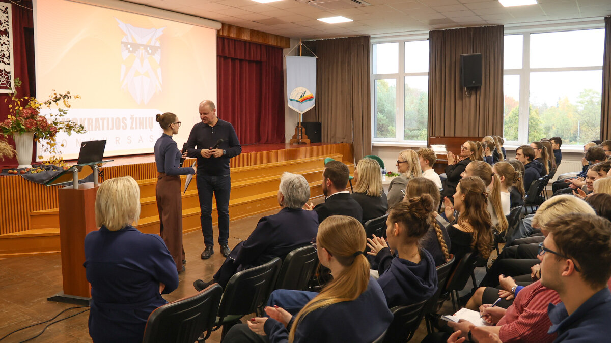 Netradicinės pamokos moderatorės istorijos mokytoja Vida Mockuvienė ir mokinė Karina Kubiliutė priminė demokratijos reikšmę, svarbius požymius, pateikė keletą konkrečių demokratinio valdymo pavyzdžių ir pakvietė savo įžvalgomis pasidalinti svečią.