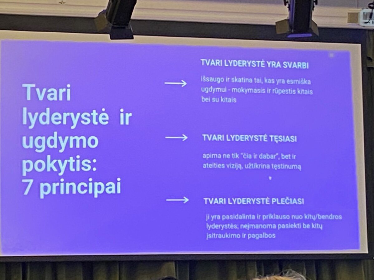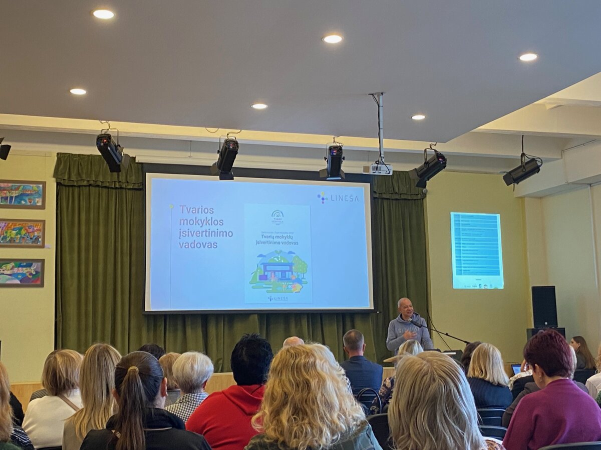 LINEŠA Tvarumo plėtros skyriaus vadovas Almantas Kulbis perskaitė pranešimą „Tvari mokykla 2030: nuo įsivertinimo iki tvarios mokyklos vertybių“, kuriame pristatė tvarios mokyklos modelį ir įsivertinimo svarbą kuriant darnų švietimo kelią. VU Filosofijos fakulteto, Ugdymo mokslų instituto docentė dr. Sandra Kairė dalijosi įžvalgomis apie tvarumo lyderystės stiprinimą švietimo bendruomenėje, pabrėždama mokytojų ir mokinių įsitraukimo reikšmę kuriant tvarią ateitį.