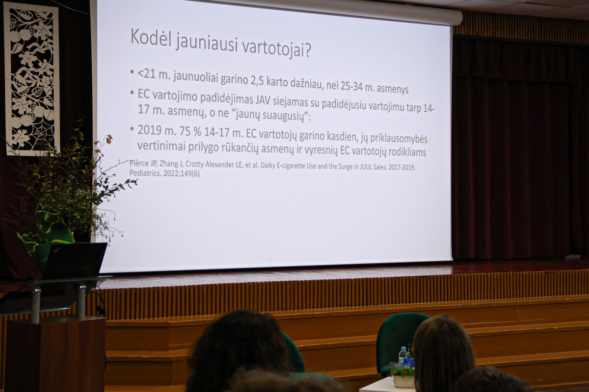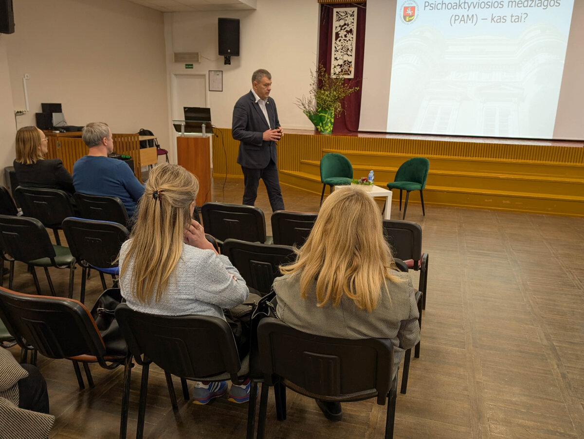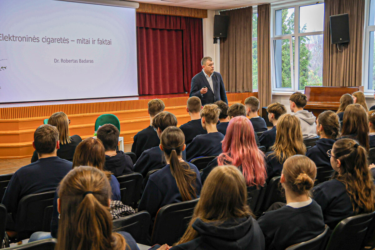 Gimnazijos mokiniai klausė paskaitos tema „Elektroninės cigaretės – mitai ir faktai“. Paskaita „Naujos psichoaktyviosios medžiagos – ką renkasi Z karta?“ skirta visų Klaipėdos rajono mokyklų mokytojams, pagalbos specialistams, vadovams, Vaiko gerovės komisijos nariams, visų Klaipėdos rajono mokyklų mokinių tėvams.