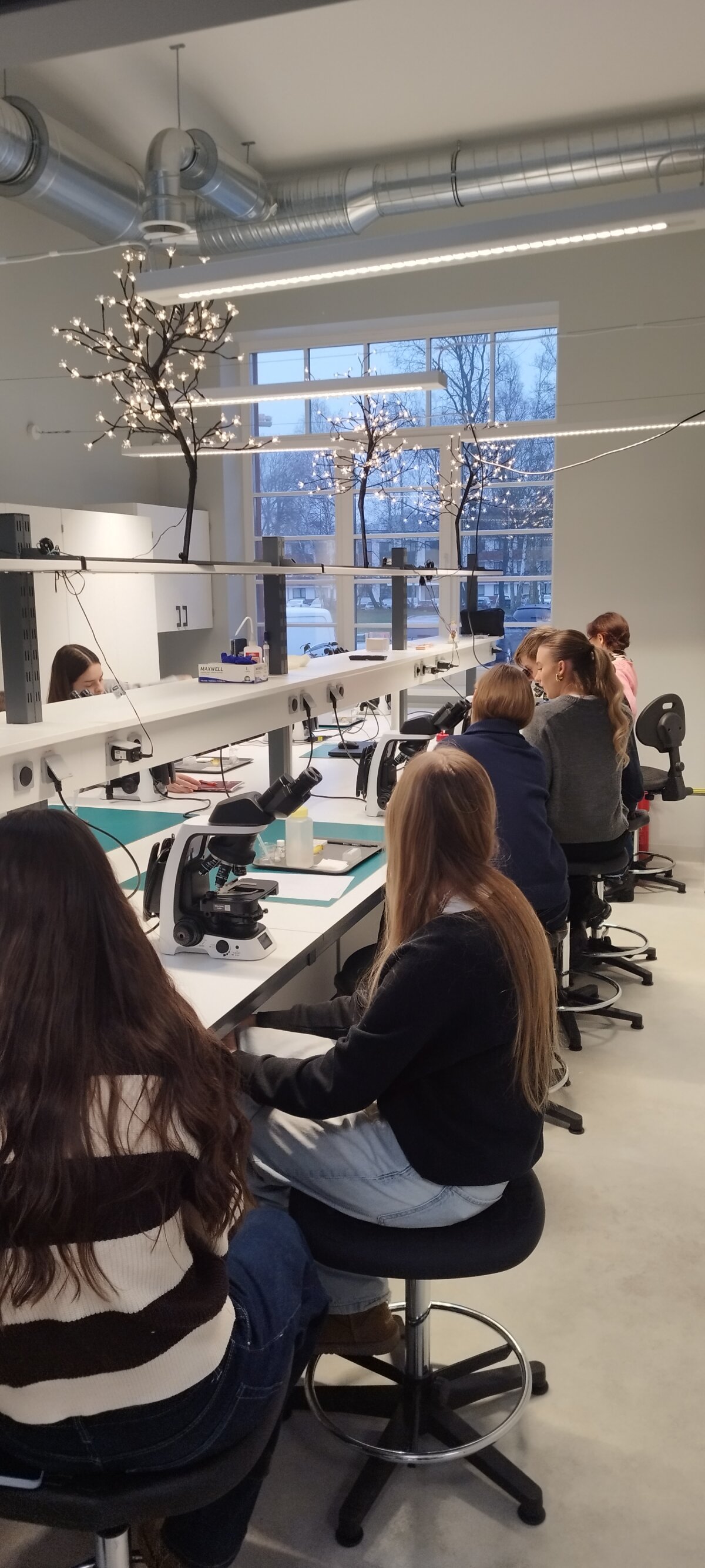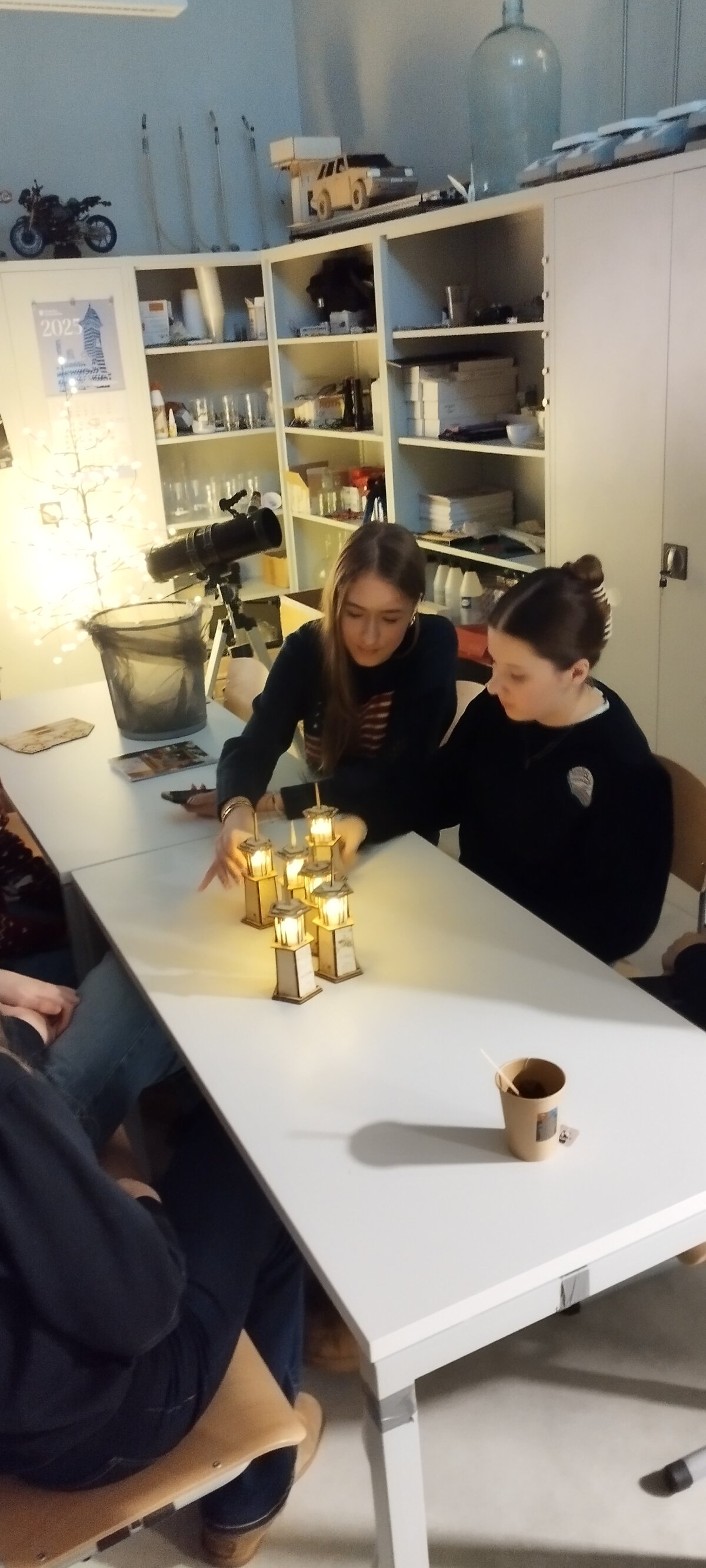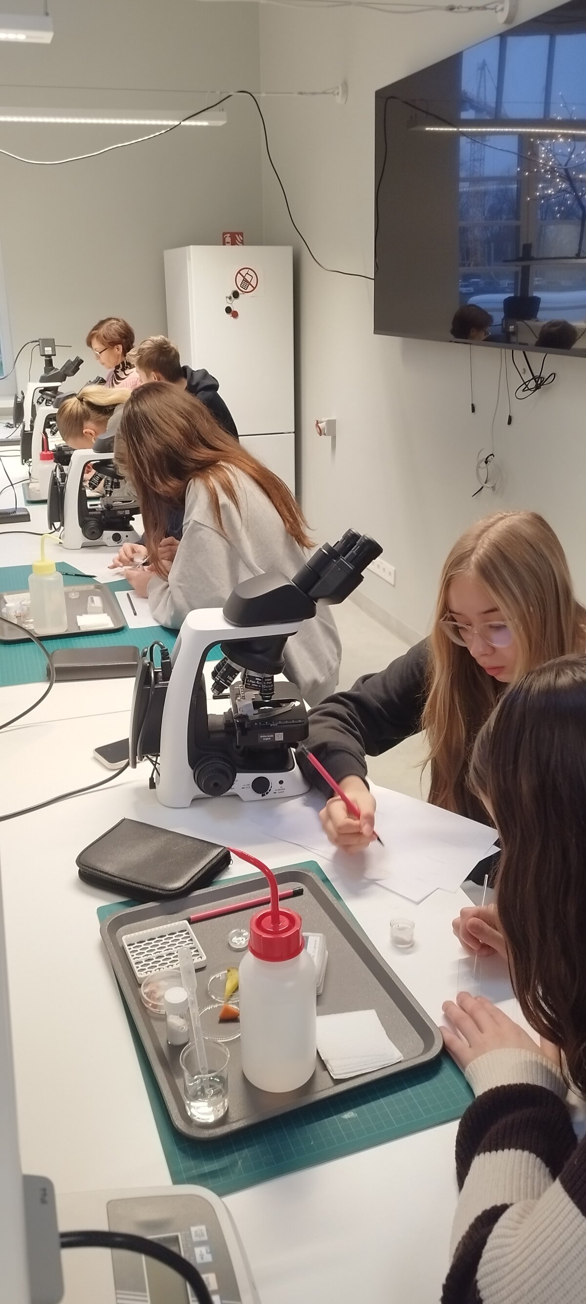 Chemijos-Biologijos laboratorijoje Iu klasės mokiniai tyrinėjo mikrokristalus, aptinkamus įvairiuose produktuose. Didžiausią įspūdį daugumai paliko druskos makrokristalai: jie buvo piramidės formos. Paskutinėje pamokoje pabaigtas darbas, pradėtas IT-Robotikos laboratorijoje: iš išpjaustytų detalių gimnazistai statė kalėdinį švyturį, kuris pavyko labai gražus ir puikiai tiks papuošti šventinį stalą.