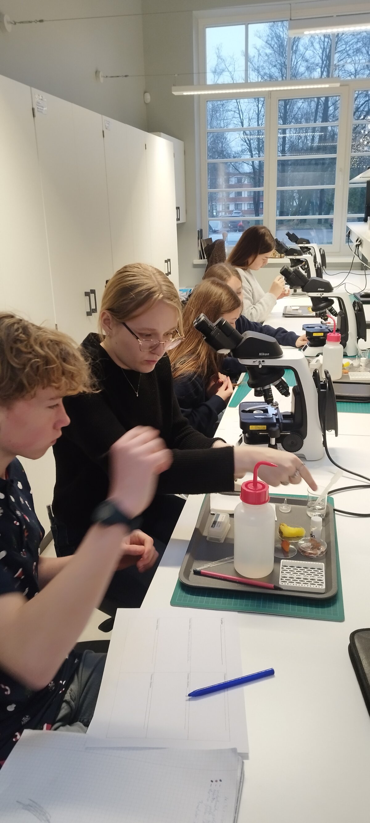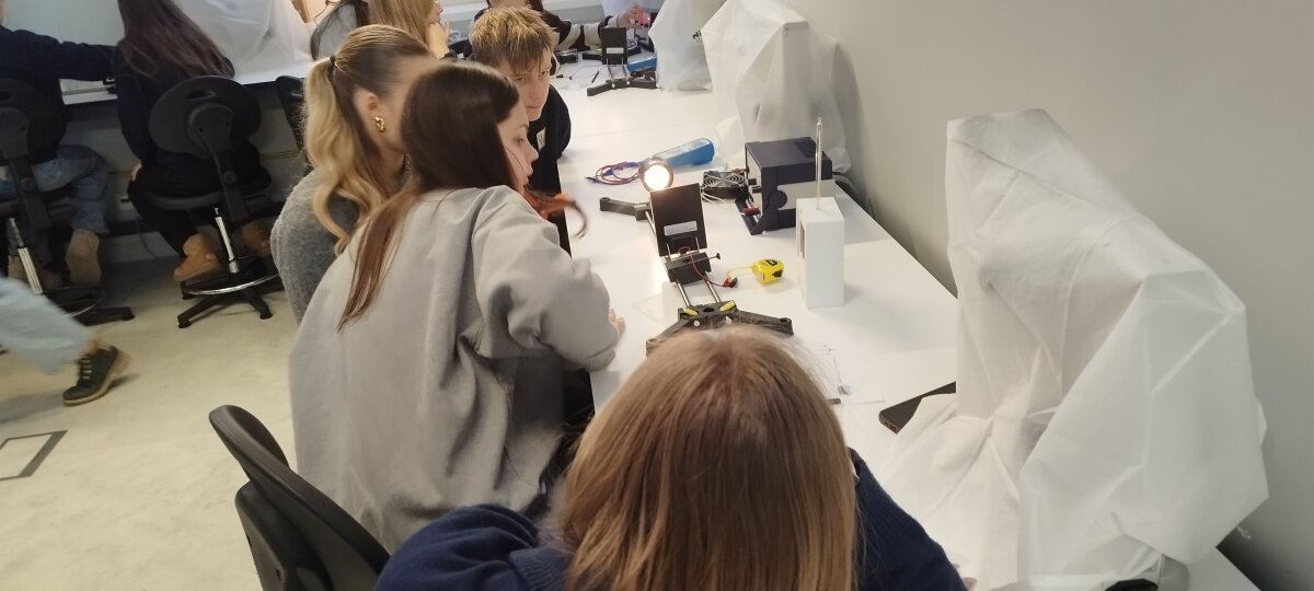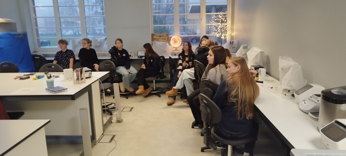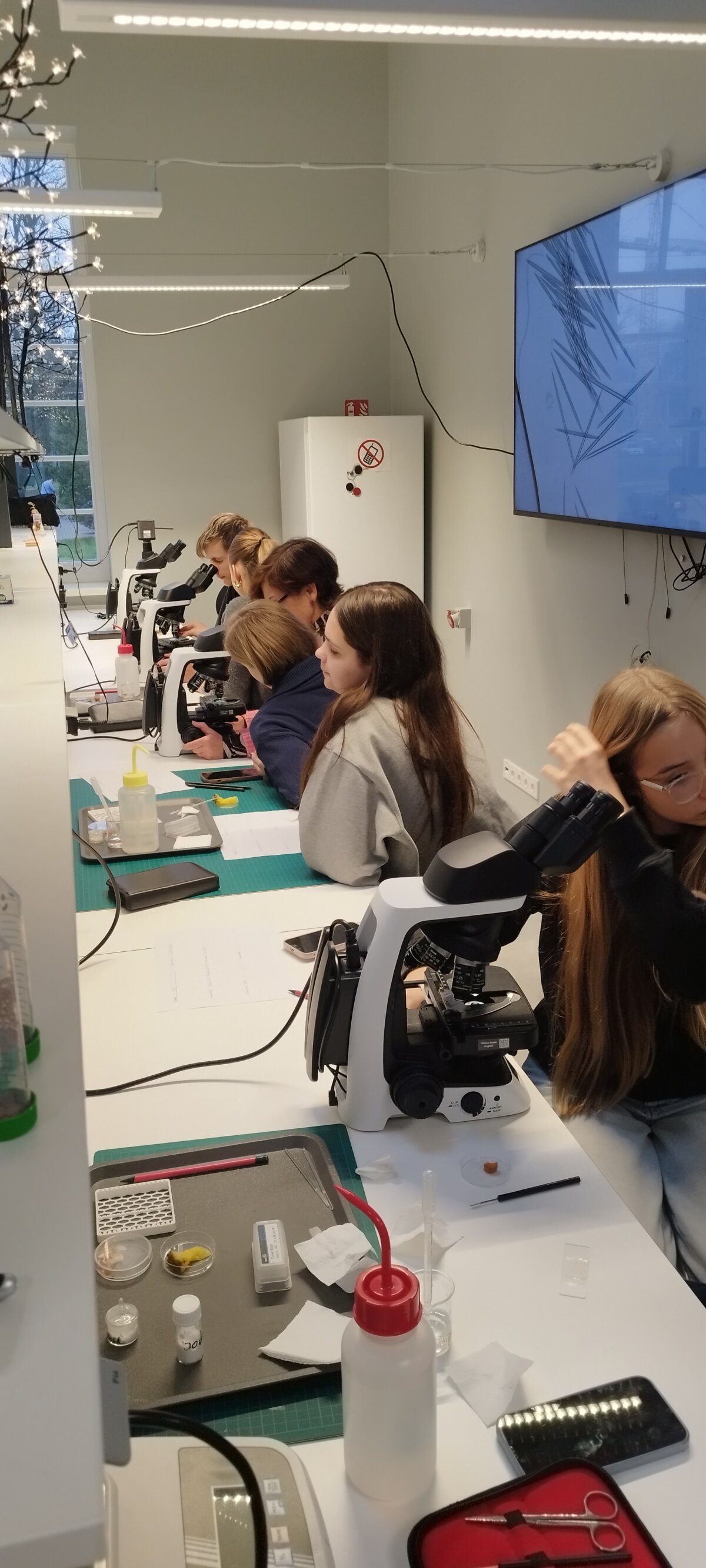 Chemijos-Biologijos laboratorijoje Iu klasės mokiniai tyrinėjo mikrokristalus, aptinkamus įvairiuose produktuose. Didžiausią įspūdį daugumai paliko druskos makrokristalai: jie buvo piramidės formos. Paskutinėje pamokoje pabaigtas darbas, pradėtas IT-Robotikos laboratorijoje: iš išpjaustytų detalių gimnazistai statė kalėdinį švyturį, kuris pavyko labai gražus ir puikiai tiks papuošti šventinį stalą.