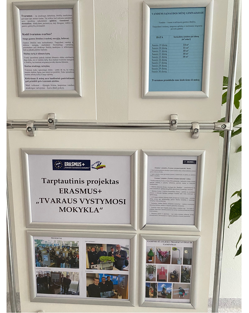 Informacija apie sunaudotą vandenį yra viešai skelbiama stende pirmo aukšto fojė, kad visa mokyklos bendruomenė galėtų stebėti pokyčius ir prisidėti prie tvaresnių sprendimų.