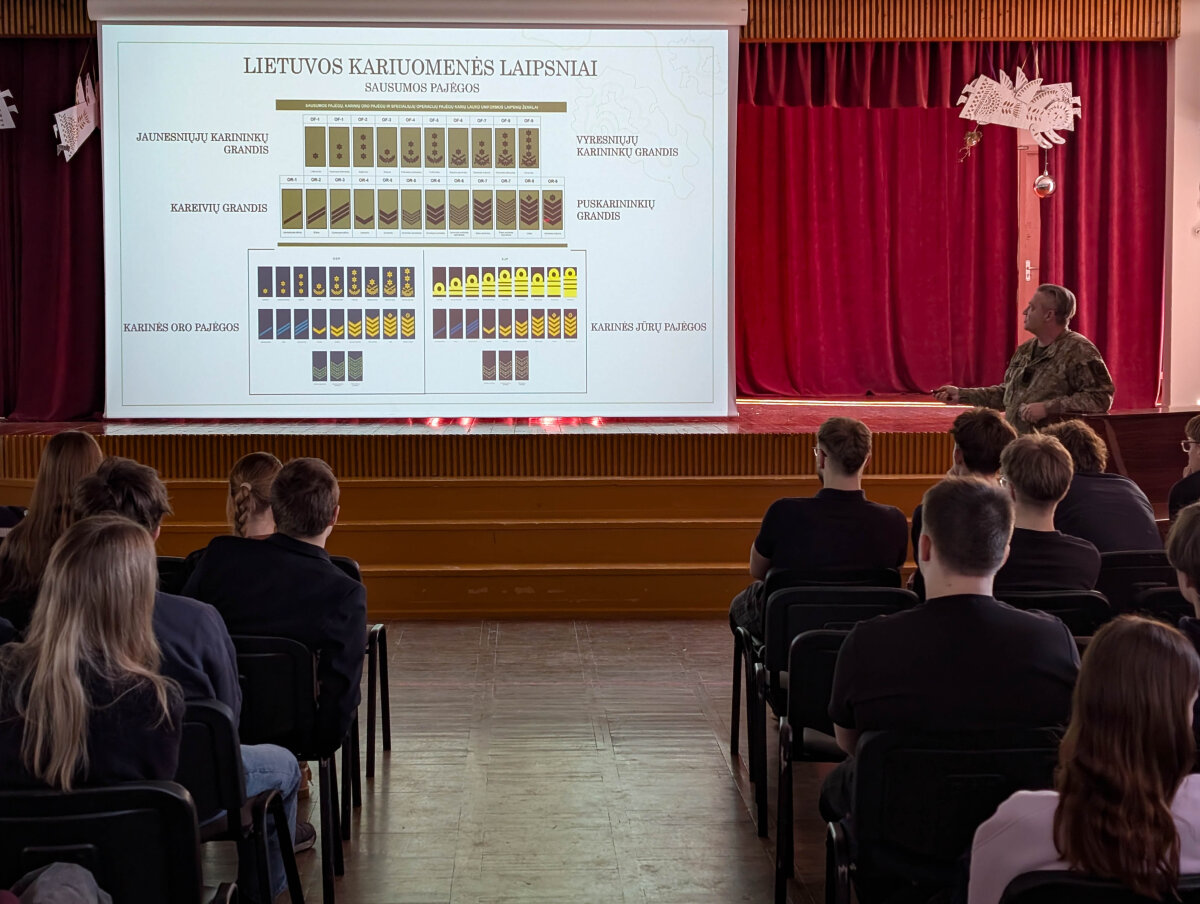 Mokiniai susipažino su Lietuvos kariuomenės sandara – Sausumos, Karinėmis oro ir Karinėmis jūrų pajėgomis, taip pat kitais padaliniais bei jų funkcijomis. Buvo aptarta kariuomenės laipsnių sistema ir paaiškinta, kaip veikia visa Krašto apsaugos sistema. Gimnazistai turėjo galimybę užduoti klausimų apie tarnybą, atsakomybę ir karių kasdienybę.