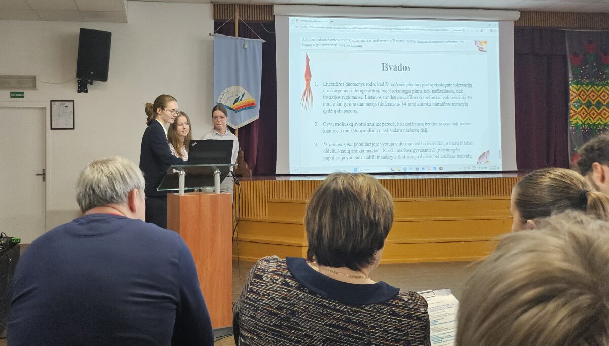 Matematikos mokytoja D. Galeckienė, mokinės Juventa Jašmontaitė ir Lukrecija Žmurko, Iu. Nuotraukos konferencijos dalyvių