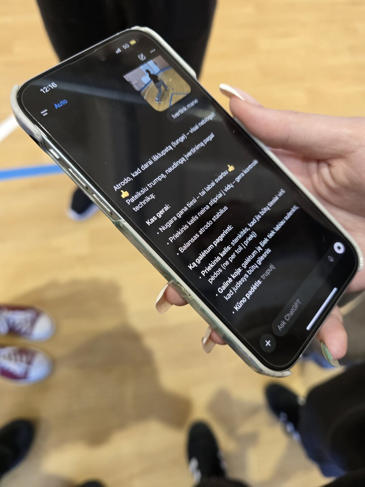 Kaip pažymi pavaduotoja Ilma Agajan, fizinio ugdymo pamokose (A. Papievienė) technologijos naudojamos judesių analizei, grįžtamajam ryšiui ir pažangos stebėjimui. Dirbtinis intelektas pasitelkiamas analizuojant atliekamus fizinius pratimus, vertinant techniką, įvardijant tobulinimo kryptis. Tai padeda mokiniams sąmoningiau suvokti savo kūną, judėjimą ir pažangą. Tokiu būdu technologija plečia ugdymo ribas – ji tampa ne tik pažinimo, bet ir sąmoningo veikimo įrankiu.