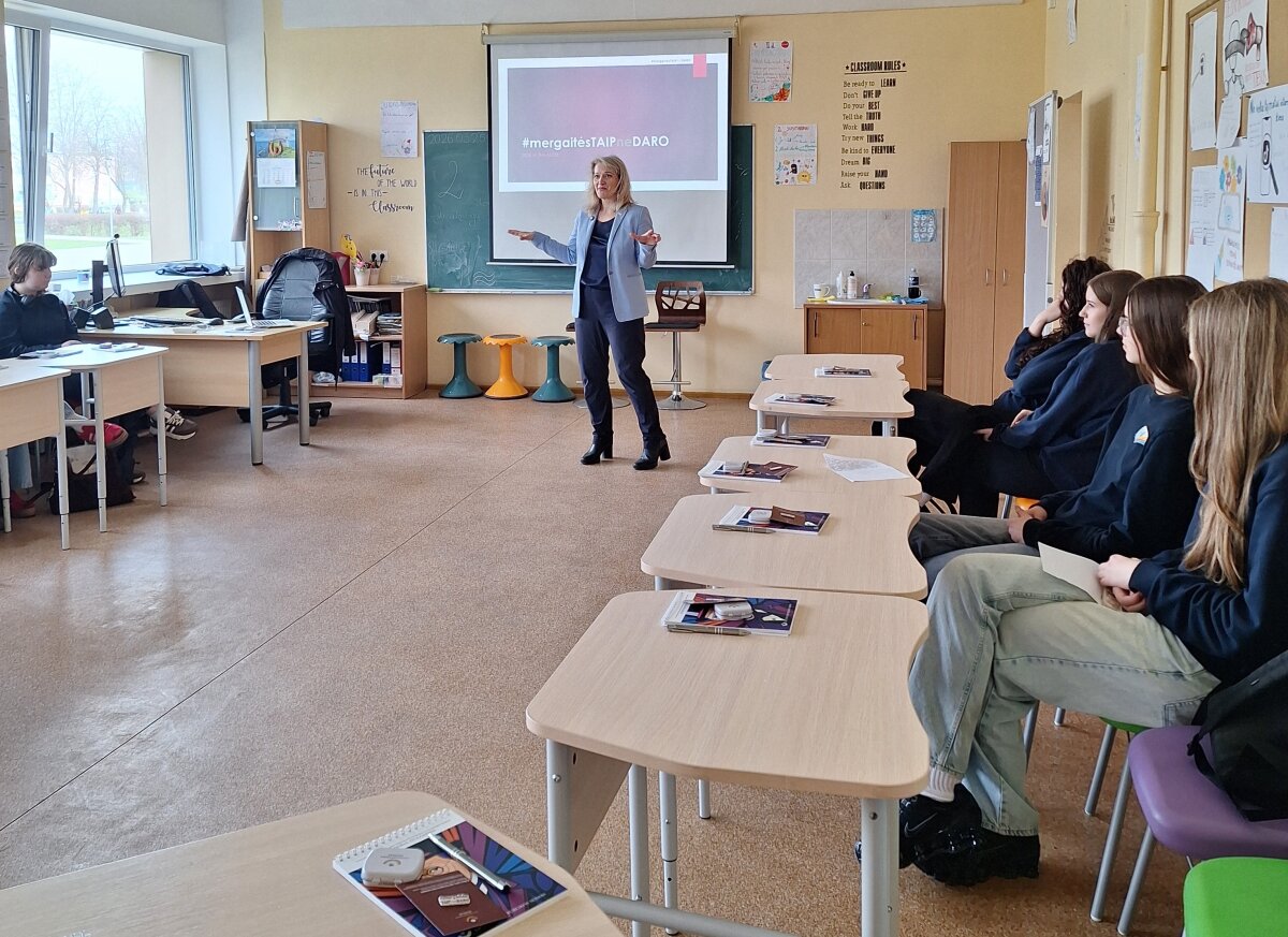 Susitikimo metu buvo kalbama apie temas, kurios jaunoms merginoms itin svarbios, tačiau dažnai lieka neišsakytos: drąsą, lyderystę, savivertę ir gebėjimą būti girdimai. Gimnazistės aktyviai įsitraukė į diskusiją – drąsiai kėlė klausimus, dalijosi mintimis ir siūlė idėjas, kaip stiprinti mergaičių lyderystę Lietuvoje ir pasaulyje.