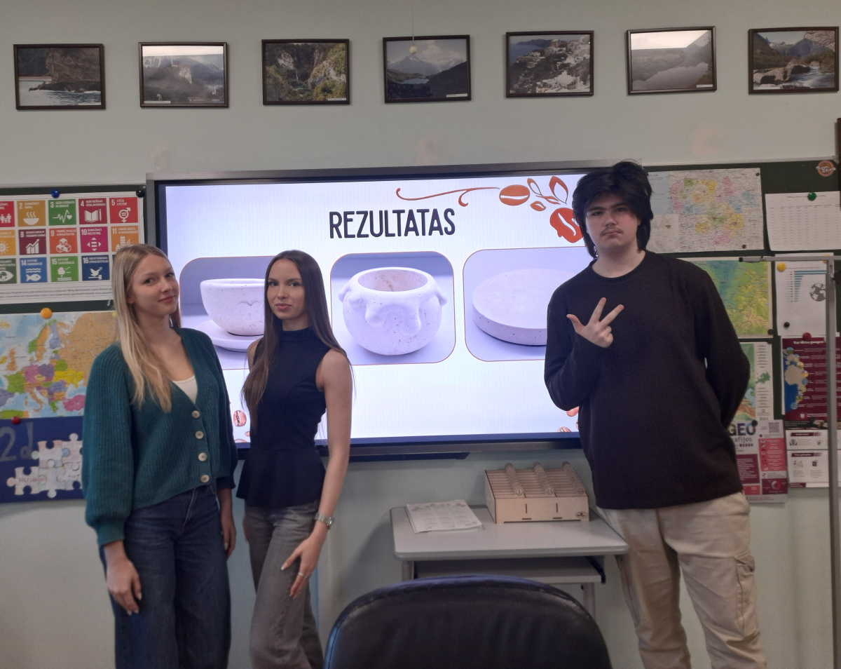 Gargždų „Vaivorykštės“ gimnazijos IIIe klasės mokinys Domas Jaškevičius ir IVb klasės mokinės Rusnė Pučkoriutė, Meda Paulikaitė pristatė tiriamąjį darbą „Kavos tirščių panaudojimo galimybės biokompozitų gamyboje“. Darbo vadovės – chemijos mokytoja metodininkė Jurgita Gerulskienė ir geografijos mokytoja metodininkė Jurga Venckauskienė. Tyrimo metu mokiniai analizavo, kaip kavos tirščiai gali būti panaudojami kuriant biokompozitus – medžiagas, sudarytas iš natūralių komponentų, galinčias pakeisti tradicinius plastikus ar kitas mažiau aplinkai draugiškas medžiagas. Kavos tirščiai pasižymi savybėmis, leidžiančiomis juos naudoti kaip užpildą ar struktūrinę medžiagą, todėl jie gali būti integruojami į įvairius kompozitus.