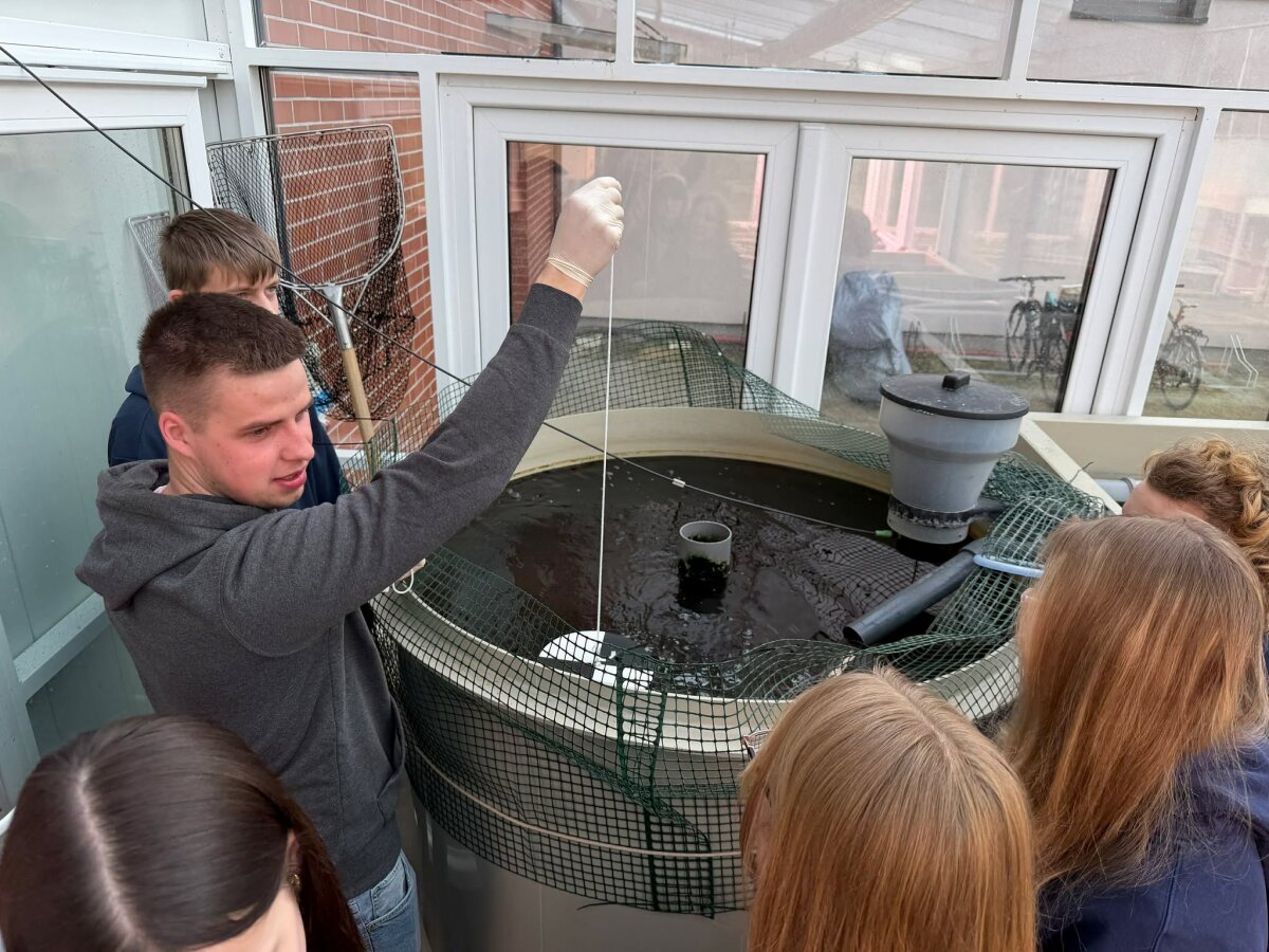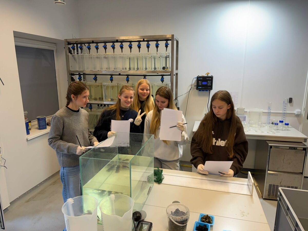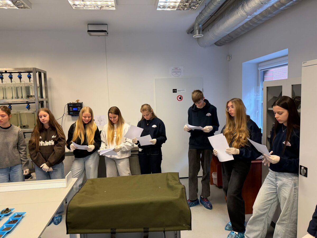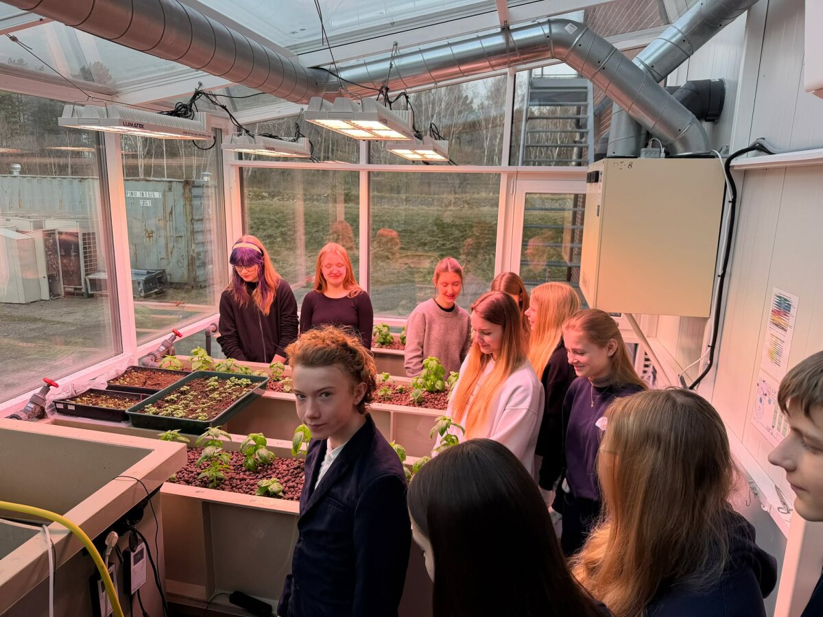Vėliau persikėlėme į akvaponikos laboratoriją. Ten tyrėme augalus – matavome jų aukštį, skaičiavome lapus ir nustatėme aplinkos temperatūrą. Taip pat analizavome vandens kokybę: matavome pH, deguonies kiekį bei nustatėme amonio, nitritų ir nitratų koncentraciją.