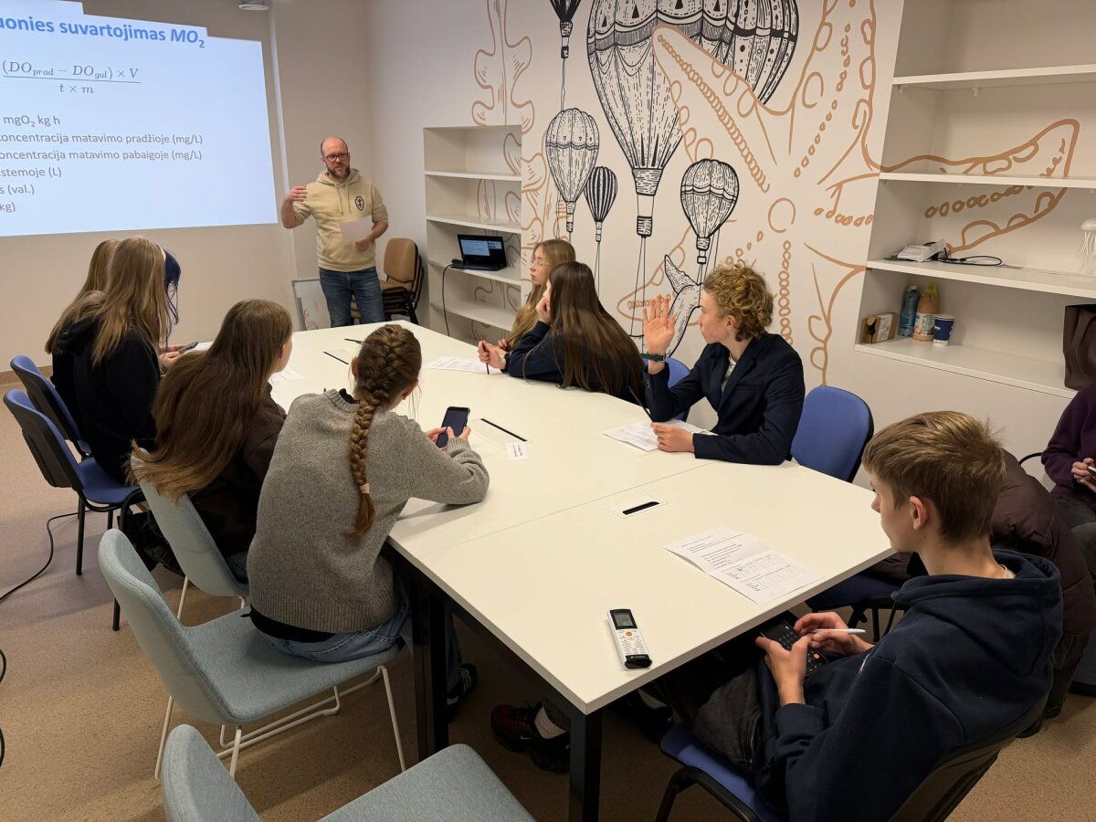 Pirmame užsiėmime nagrinėjome streso poveikį žuvies metabolizmui. Stebėjome, kaip kinta žuvų kvėpavimas skirtingomis sąlygomis ir kada jis tampa intensyvesnis. Atlikome skaičiavimus ir bandėme suprasti, kaip stresas veikia jų organizmą.
