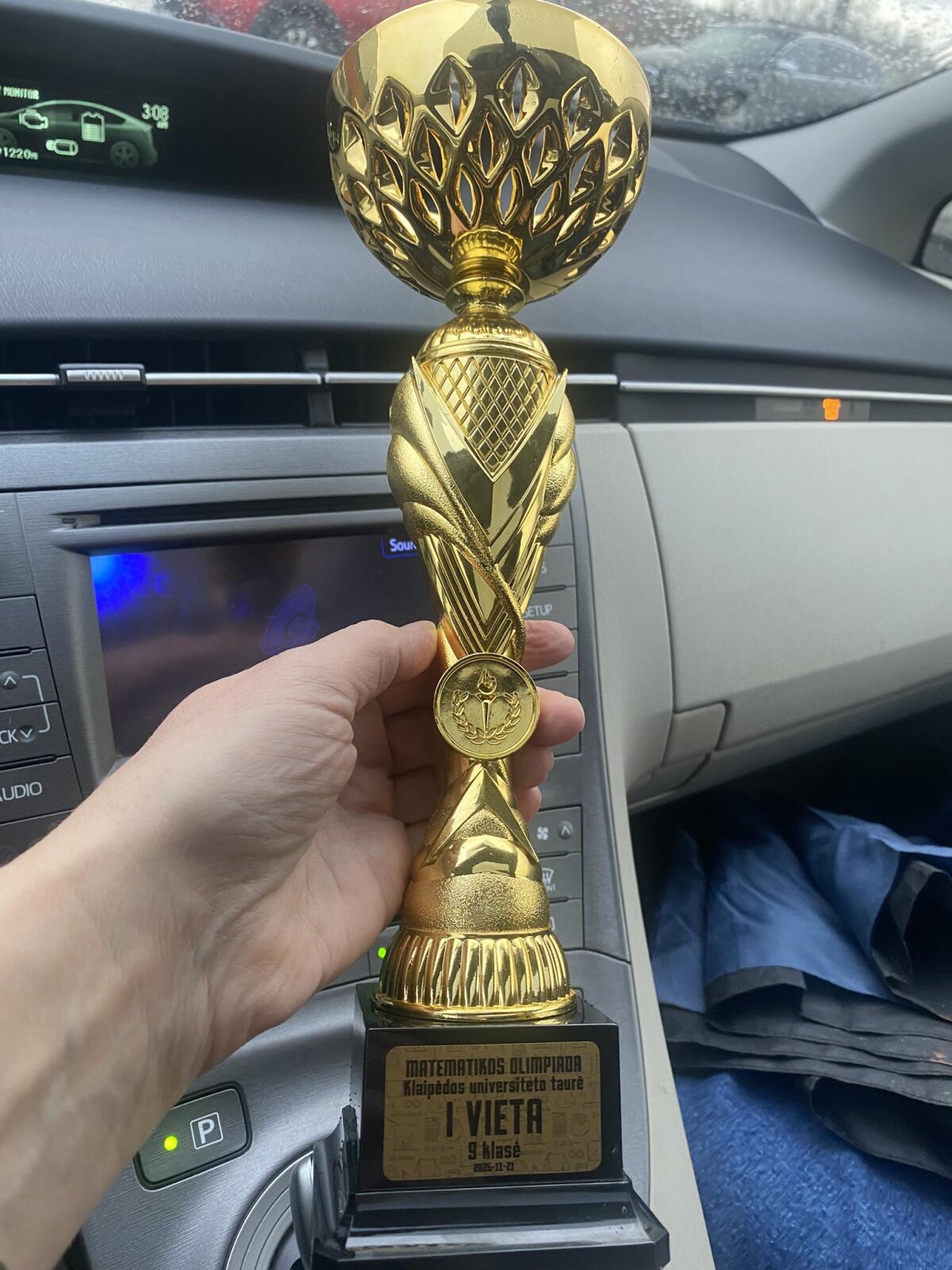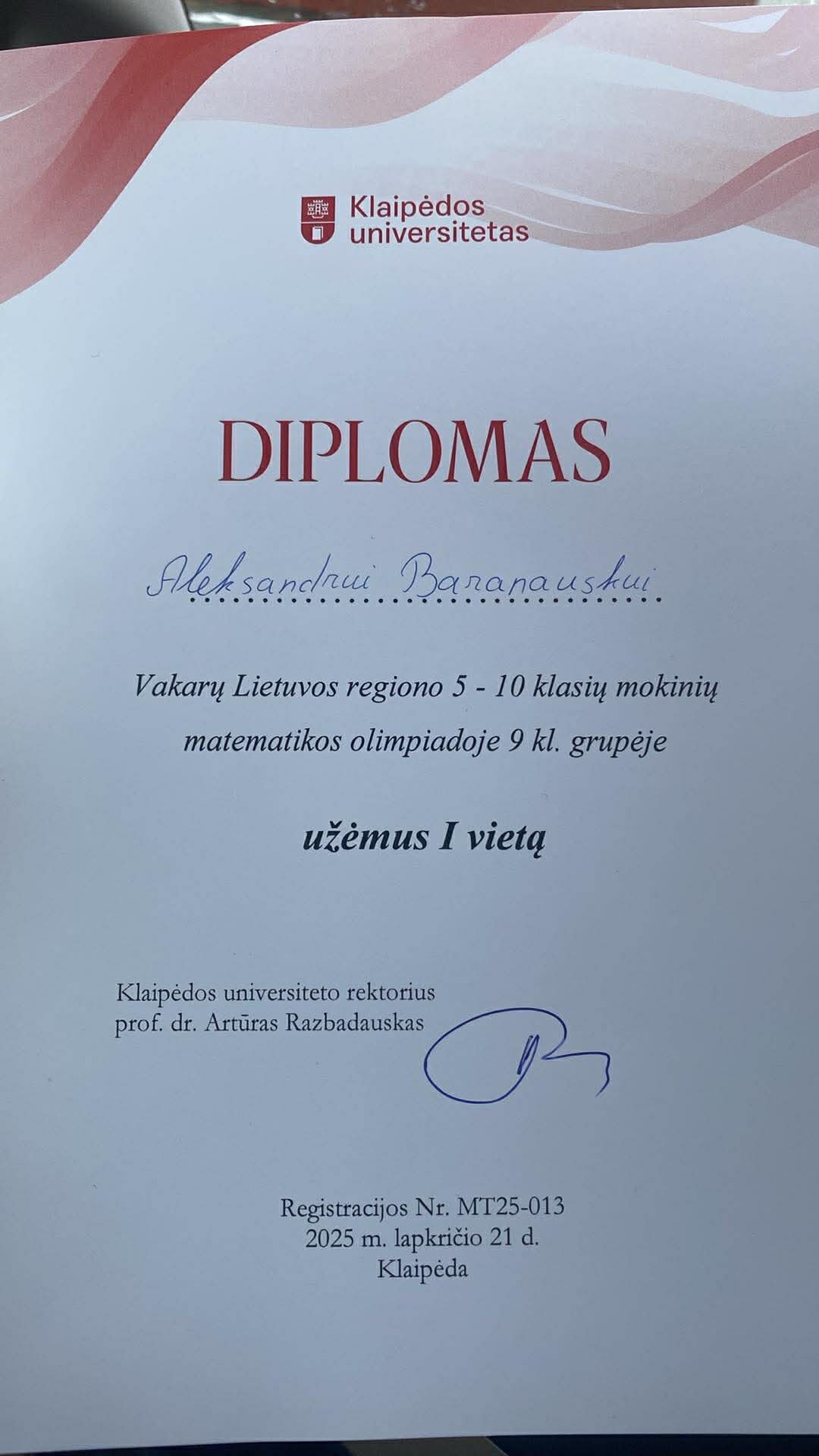 Sveikiname Iu klasės gimnazistą Aleksandrą Baranauską, Vakarų Lietuvos regiono 5–10 kl. mokinių matematikos olimpiadoje (devintokų grupėje) užėmusį I vietą, laimėjusį Klaipėdos universiteto taurę. Mokinį konsultavo gimnazijos matematikos mokytoja Donata Galeckienė.