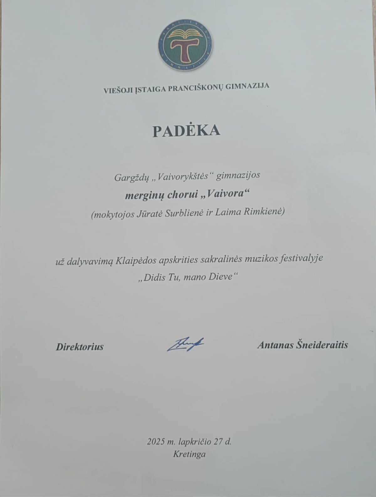 Lapkričio pabaigoje Gargždų „Vaivorykštės“ gimnazijos merginų choras „Vaivora“, vadovaujamas muzikos mokytojų Jūratės Surblienės ir Laimos Rimkienės, dalyvavo Kretingos Pranciškonų gimnazijos surengtame sakralinės muzikos festivalyje „Didis Tu, mano Dieve“. Renginys skirtas puoselėti krikščioniškųjų vertybių tradicijas.