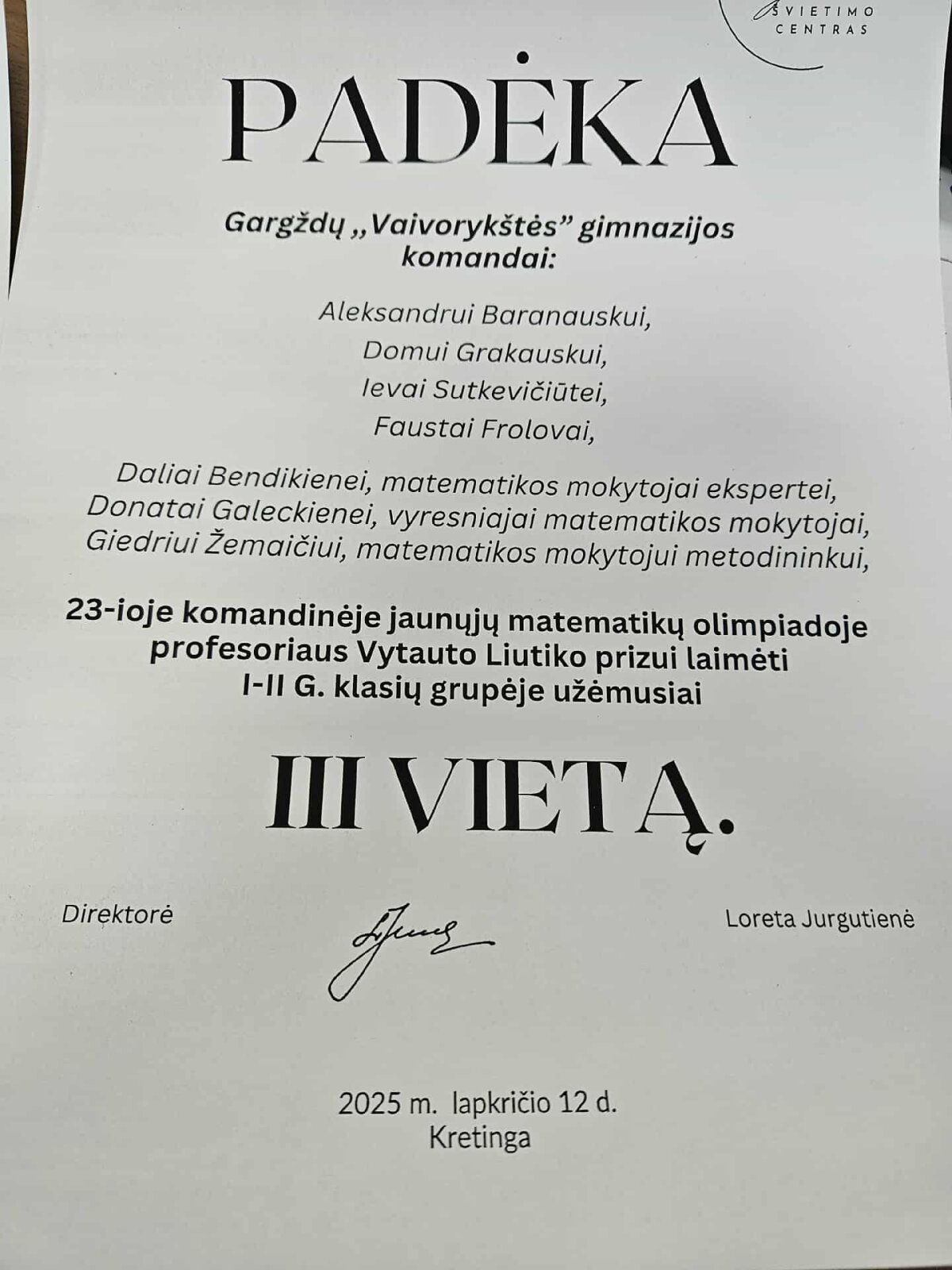 Sveikiname III vietos laimėtojus: M. Riekašių, T. Masiulį, A. Stasaitytę, Ū. Stroputę – III-IV klasių grupėje; A. Baranauską, D. Grakauską, I. Sutkevičiūtę, F. Frolovą – I-II klasių grupėje. Mokiniams olimpiadai ruoštis padėjo matematikos mokytojai D. Bendikienė, D. Galeckienė, G. Žemaitis.