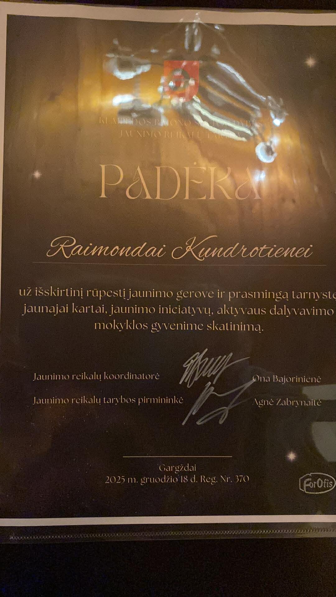 Džiugu, kad padėkos raštais apdovanoti IIi klasės gimnazistai: Jonas Samoškis, Agnė Pučinskaitė, Greta Grikšaitė, Agnė Riaukaitė, Ieva Sutkevičiūtė, Vaiva Rimkutė, Greta Daukantė, Gustas Apanavičius, Fausta Frolova, Ana Tomchuk, Armandas Miežetis, Jonas Samoškis, Rusnė Lukauskaitė, Gustė Budvytytė, Jurtė Meižytė, Austėja Vyšniauskaitė, Eva Parnarauskaitė – ir jų klasės vadovė, biologijos mokytoja Raimonda Kundrotienė.