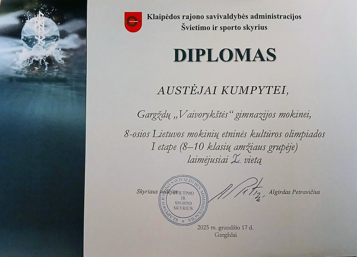 Sveikiname Iu klasės mokinę Austėją Kumpytę! Gimnazistė VIII etninės kultūros olimpiadoje savivaldybės etape užėmė 1 vietą. Linkime gimnazistei ir ją konsultuojančioms mokytojoms Ilonai Tulabienei, Zofijai Vaitkuvienei sėkmės II etape, kur varžysis regiono etninės kultūros puoselėtojai.