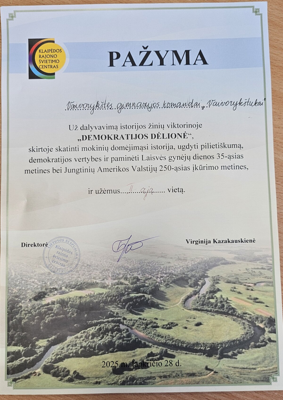 Sveikiname gimnazijos I–II klasių komandą (Martą Rumšaitę, Aurėją Vaičikauskaitę, Gabiją Bagočiūtę, Deimeną Šeškaitę, Ievą Sutkevičiūtę, Evą Parnarauskaitę) ir jų istorijos mokytojas Vidą Mockuvienę, Gražiną Pupšienę, Ingridą Jančauskienę! Gimnazijos komanda Klaipėdos rajono 8–10 klasių mokinių žinių viktorinoje „Demokratijos dėlionė“ užėmė II vietą.