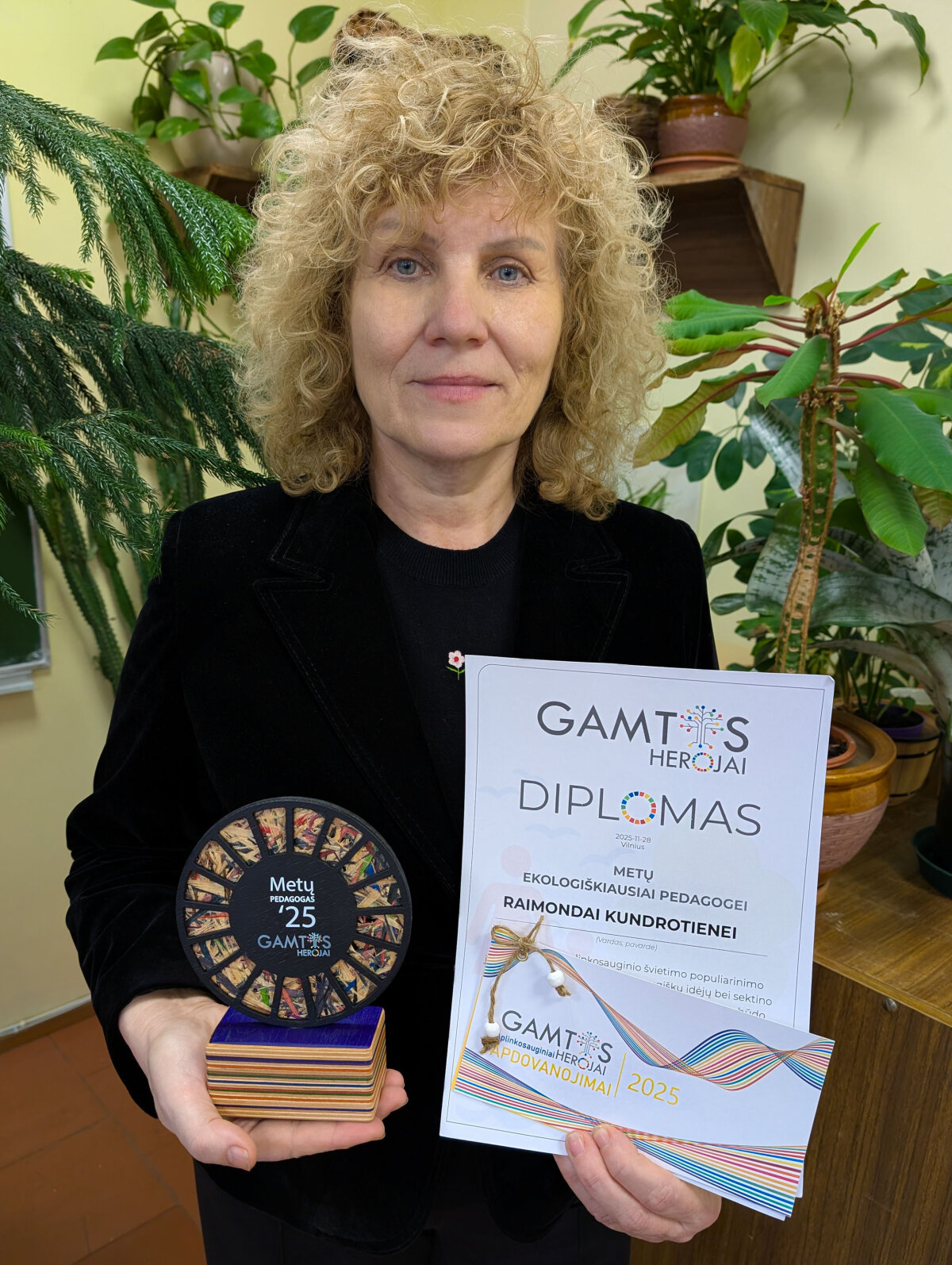 Gargždų „Vaivorykštės“ gimnazijos bendruomenę pasiekė džiugi žinia – biologijos mokytoja Raimonda Kundrotienė tapo konkurso „Gamtos herojai 2025“ Metų ekologiškiausia pedagoge. Mokytojai įteikta konkurso statulėlė ir skirta vienkartinė piniginė stipendija ekologinėms idėjoms įgyvendinti. Šis apdovanojimas kasmet skiriamas pedagogams, kurie savo veikla išsiskiria aplinkosaugos srityje, įkvepia mokinius domėtis gamtos apsauga ir tvarumo principais, o mokyklos bendruomenėje kuria pozityvius, atsakingo gyvenimo būdo pavyzdžius.