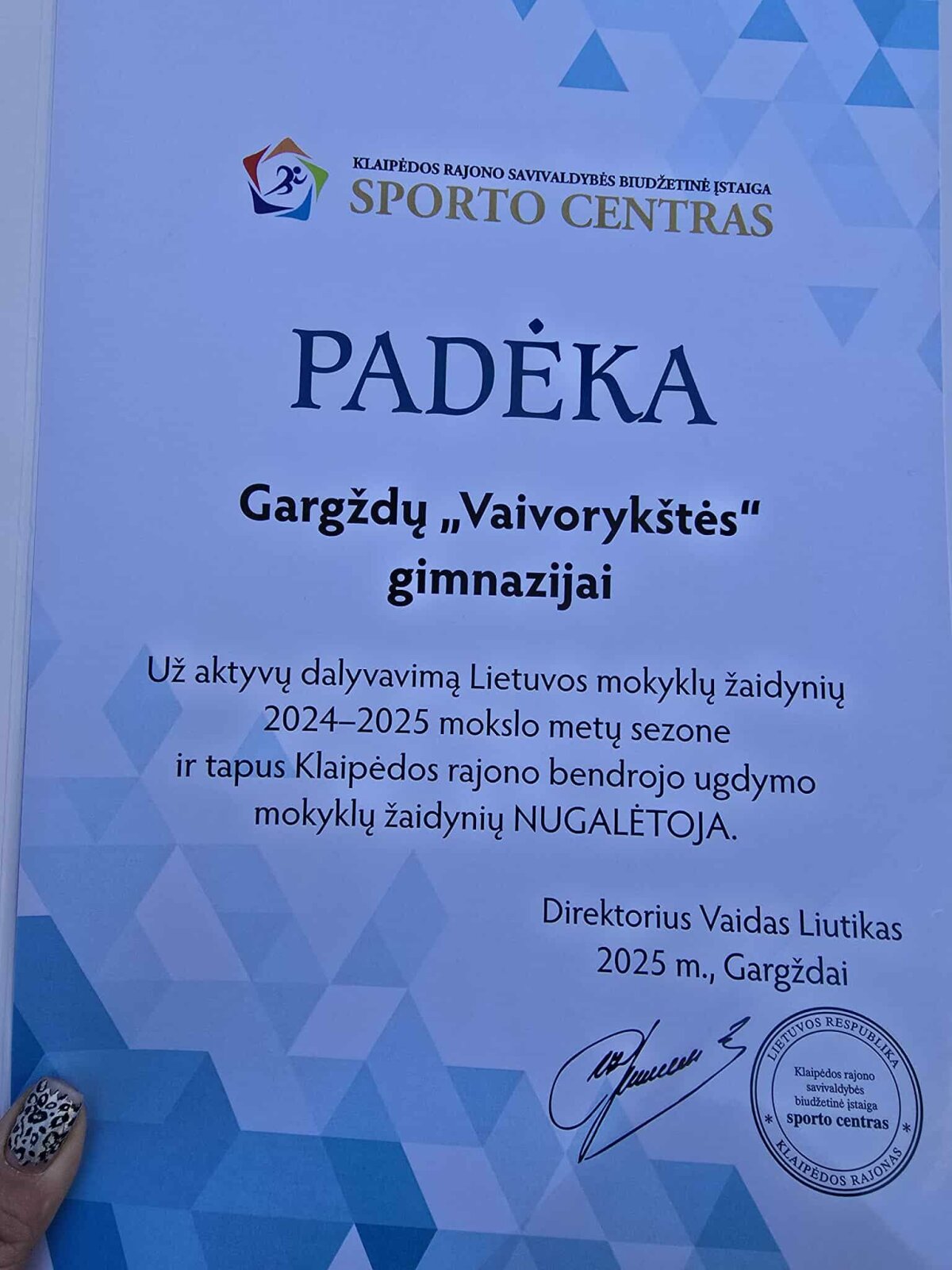 Klaipėdos rajono mokyklų žaidynėse 2024–2025 m. mūsų gimnazija tapo nugalėtoja. Lietuvoje iš 56 mokyklų likome ketvirti – puikus pasiekimas. Sveikiname aktyviai sportuojančius mokinius, atstovaujančius gimnazijai, fizinio ugdymo mokytojus Anželiną ir Tomą Papievius, Valentą Marcinkevičių!