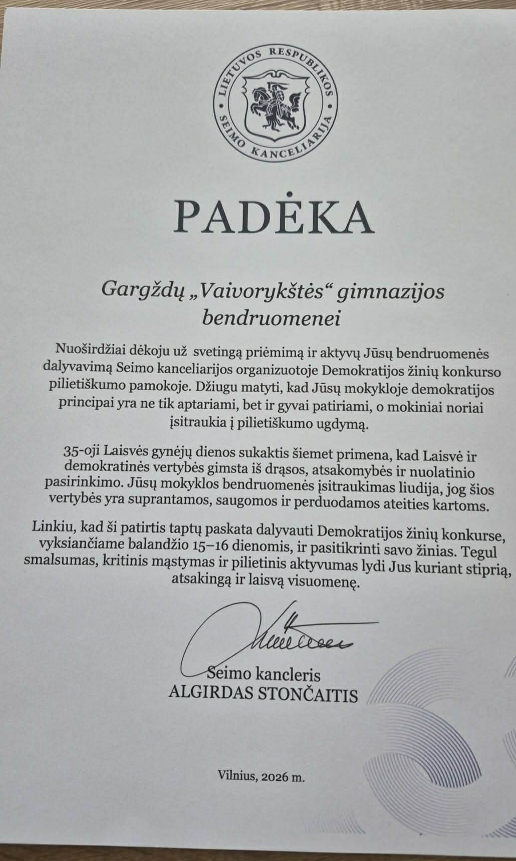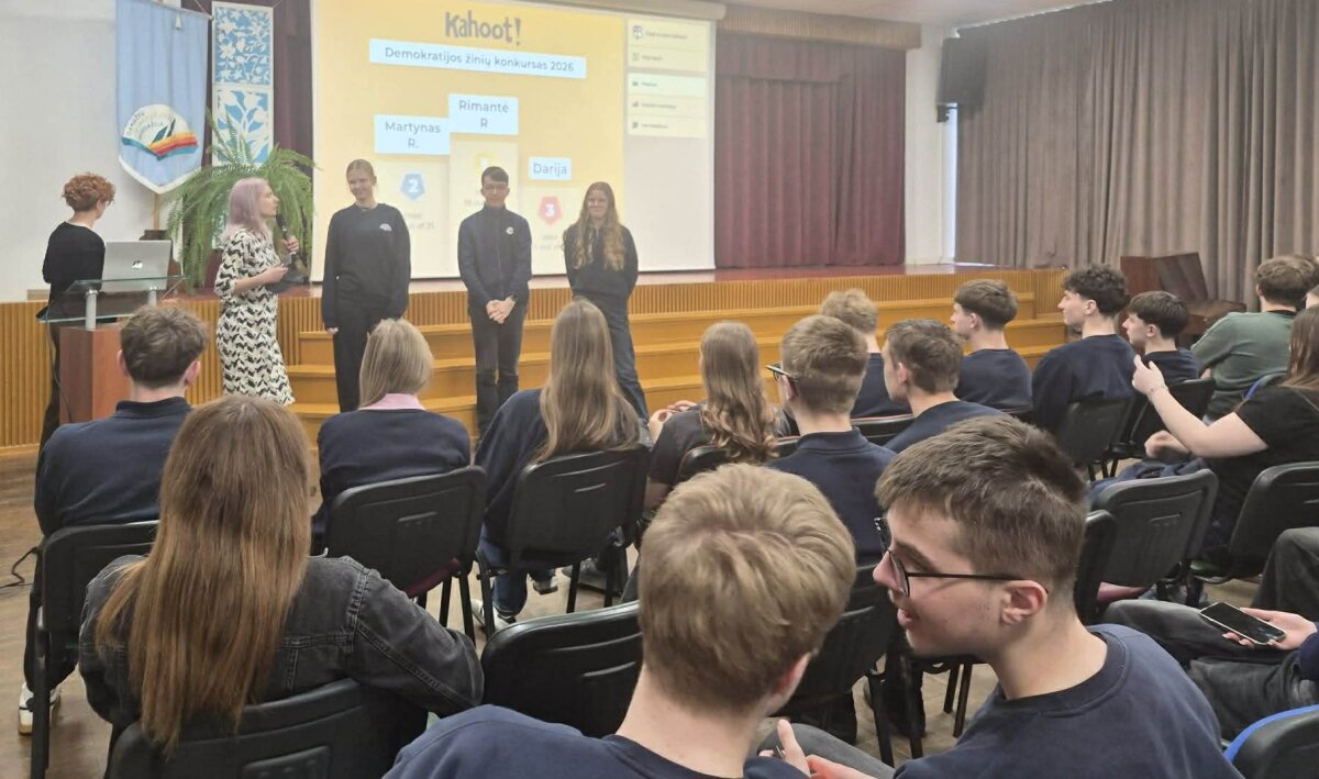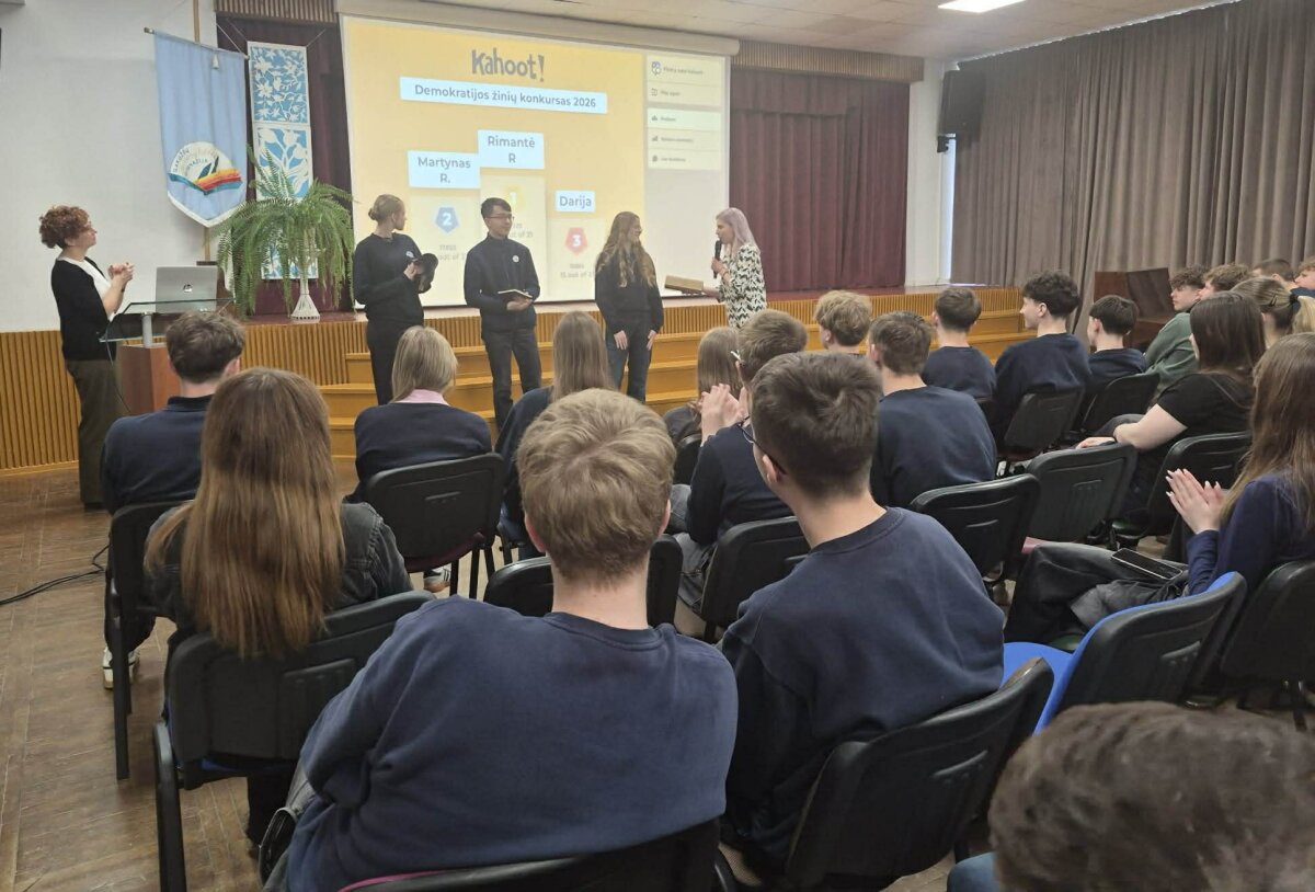Pamokos metu mokiniai gilino pilietiškumo žinias, diskutavo apie demokratiją ir dalyvavo interaktyviame klausimų-atsakymų žaidime platformoje „Kahoot!“ Puikias savo žinias parodė Ig klasės mokinė Rimantė Ruibytė ir iškovojo galimybę dalyvauti moksleivių finale, kuris vyks Seimo rūmuose 2026 m. gegužės 9 d.