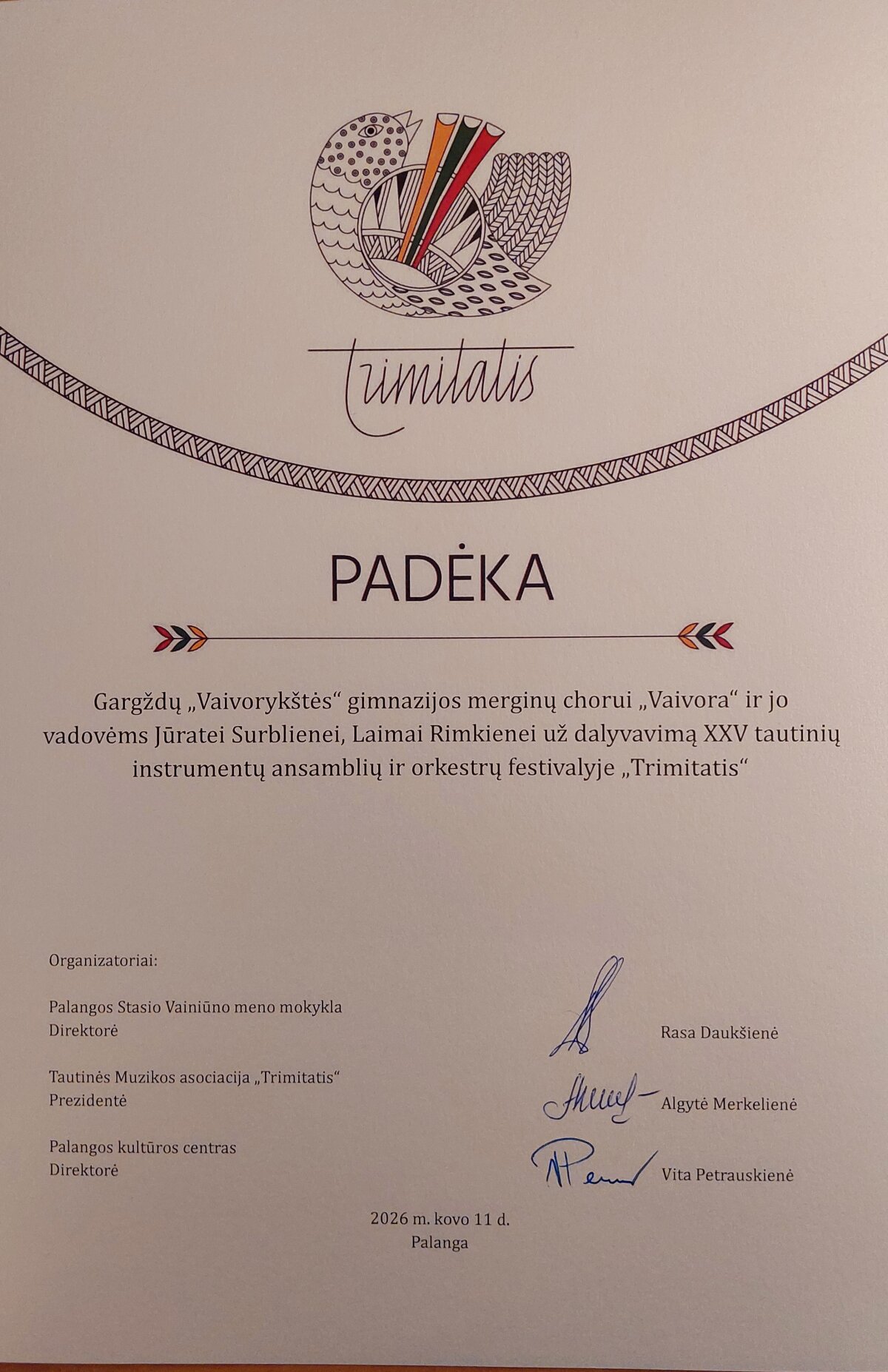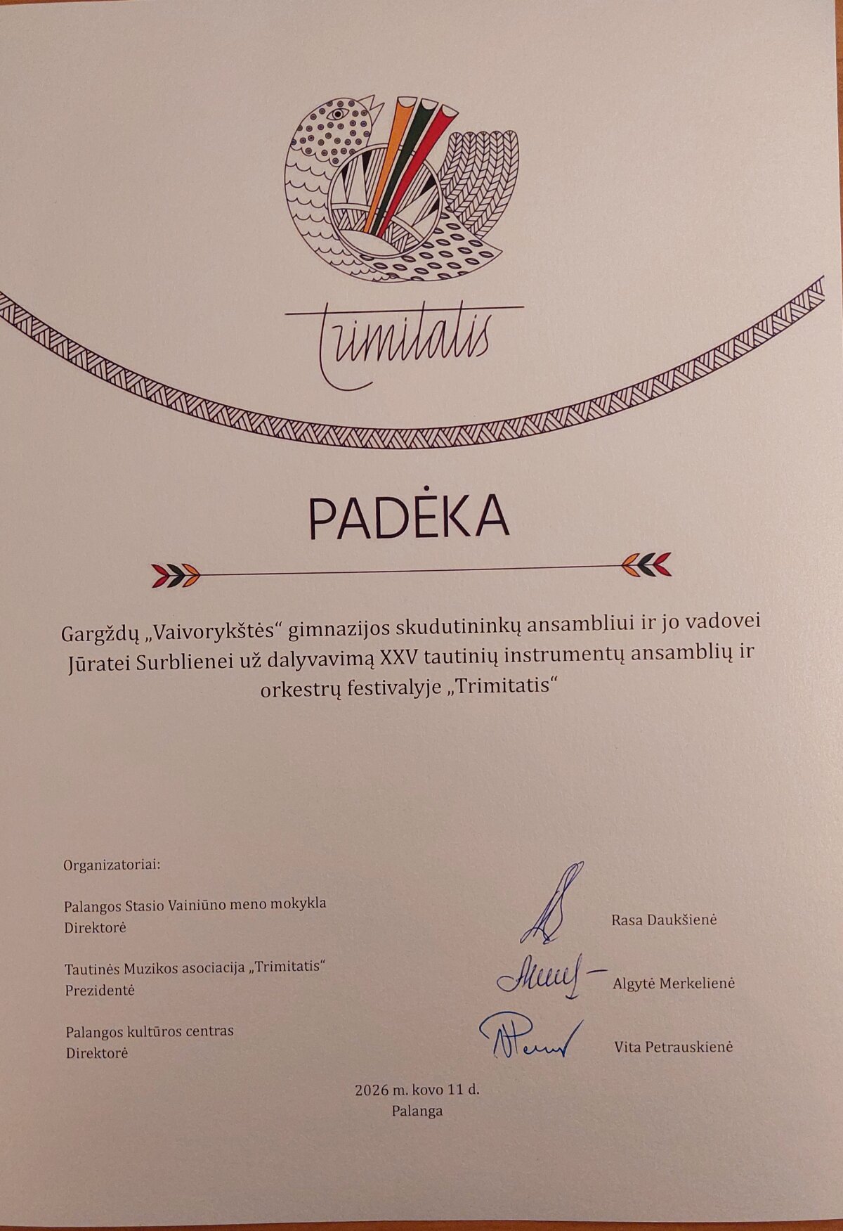Renginyje dalyvavo visų tautinių instrumentų žanrų kolektyvai: tradicinių ir koncertinių kanklių, skudučių, birbynių ansambliai, mišrūs tautinių instrumentų ansambliai ir orkestrai, vokaliniai bei folkloro ansambliai, chorai. Iš viso pasirodė daugiau nei 60 kolektyvų iš įvairių Lietuvos miestų – per 800 dalyvių. Festivalį organizavo Palangos Stasio Vainiūno meno mokykla, Tautinės muzikos asociacija „Trimitatis“ ir Palangos kultūros centras. Šiame jubiliejiniame XXV festivalyje „Trimitatis“ dalyvavo ir mūsų gimnazijos kolektyvai: merginų choras „Vaivora“ ir skudutininkų ansamblis (vadovės Laima Rimkienė ir Jūratė Surblienė).
