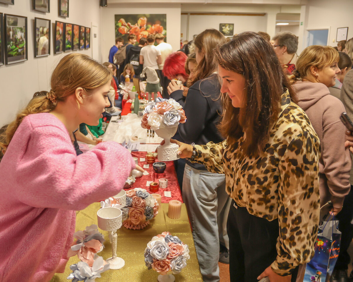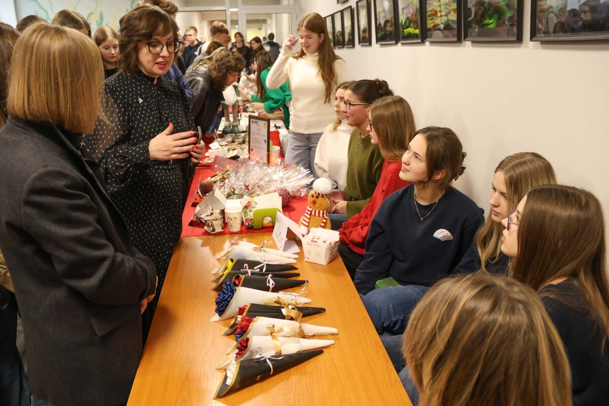 Šventinę nuotaiką gimnazijoje kūrė ir tradicinė jaunųjų verslininkų kalėdinė mugė. II aukšte šurmuliavo pirkėjai, ore tvyrojo kepinių, kūrybinių dirbtuvių dvasia. Mokiniai siūlė savo sukurtų šventinių gaminių, iškeptų skanumynų, kurtų drabužių, buvo galima net elnio ragų nusipirkti. Jaunieji antrepreneriai bendravo su pirkėjais, mokėsi skaičiuoti sąnaudas ir pajamas, derėtis bei pristatyti savo produktus. Mugė tapo gyva praktine pamoka, kurioje antreprenerystės teorija virto realia patirtimi.