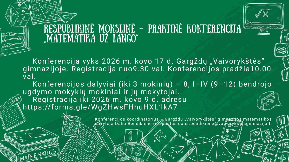 Kviečiame Jus dalyvauti respublikinėje mokslinėje-praktinėje-patyriminėje konferencijoje „Matematika už lango“, kuri vyks 2026 m. kovo 17 d. Gargždų „Vaivorykštės“ gimnazijoje (Vingio g. 6, Gargždai).