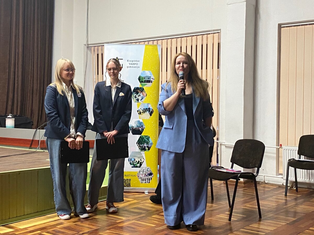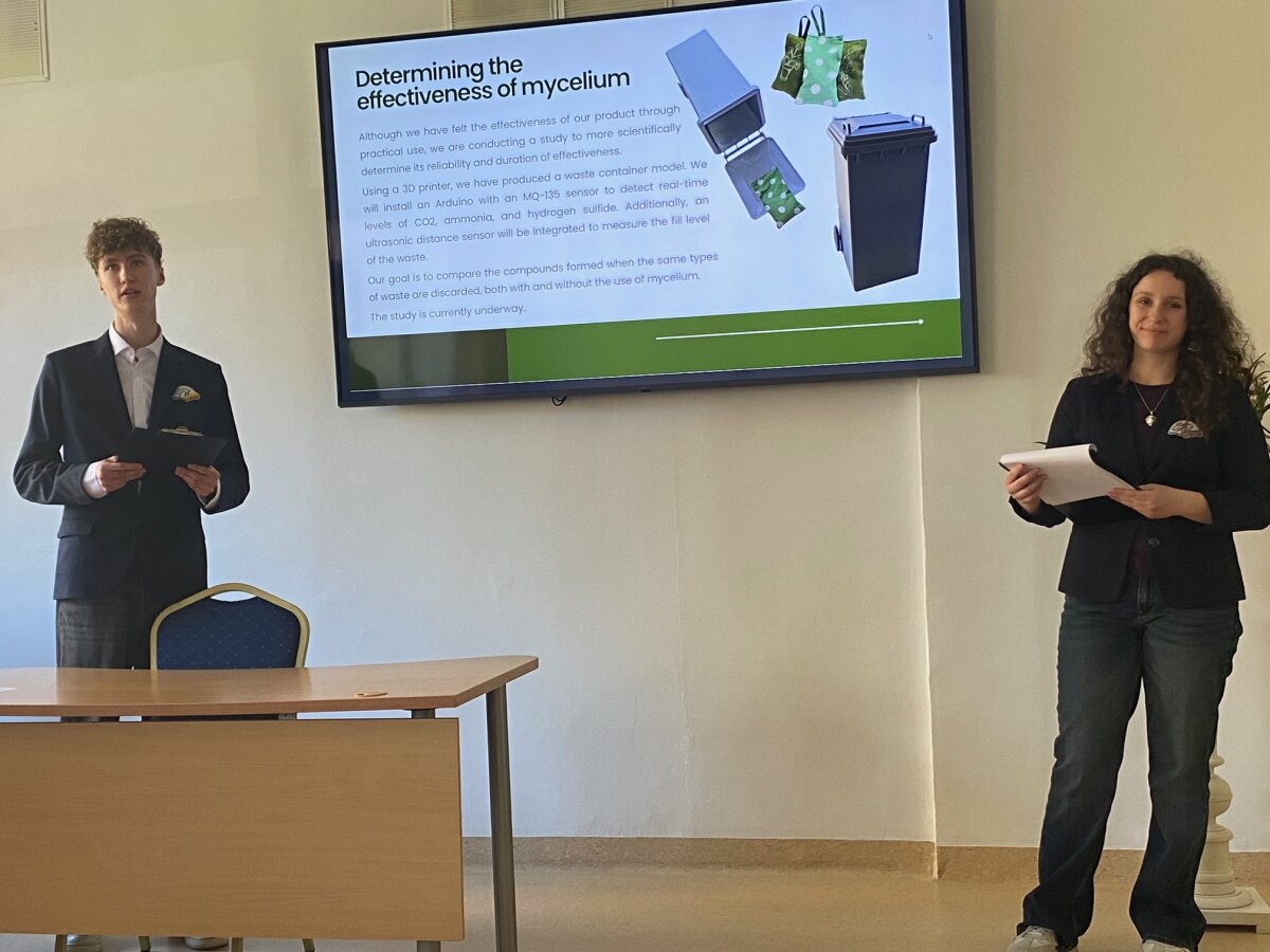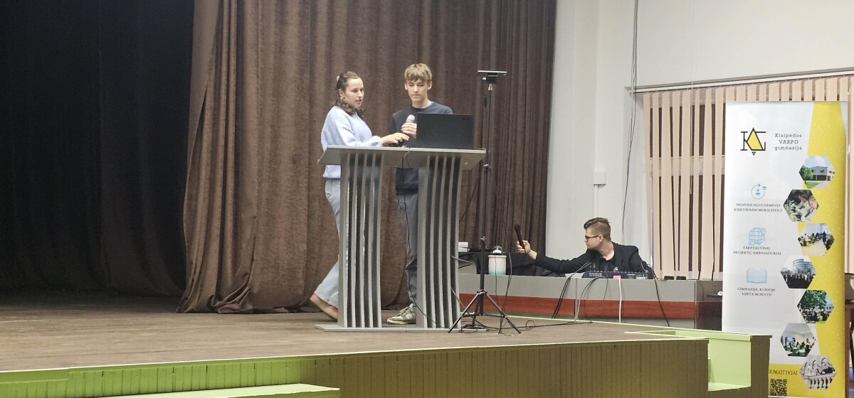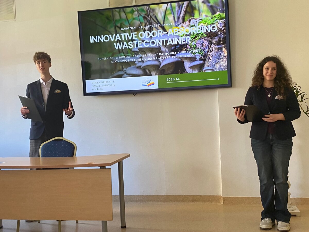 Džiugu, kad Gargždų „Vaivorykštės“ gimnazijos mokiniai aktyviai dalyvavo šiame renginyje ir pristatė savo tiriamuosius bei projektinius darbus. IIi klasės mokiniai Jonas Samoškis ir Greta Grikšaitė anglų kalba pristatė projektinį darbą „Innovative Odor-Absorbing Waste Container“. Šio projekto tikslas – sukurti inovatyvų atliekų konteinerį, galintį efektyviai sugerti nemalonius kvapus. Mokiniai analizavo įvairias kvapų neutralizavimo medžiagas ir jų veiksmingumą, ieškojo sprendimų, kaip sumažinti kvapų sklidimą iš buitinių atliekų. Toks sprendimas yra ypač aktualus urbanizuotose teritorijose bei pakrančių regionuose, kur atliekų tvarkymas daro tiesioginę įtaką aplinkos kokybei, gyvenimo komfortui. Mokinius konsultavo biologijos mokytoja ekspertė Raimonda Kundrotienė ir ekonomikos mokytoja Vida Valaitytė-Ivachnenko.