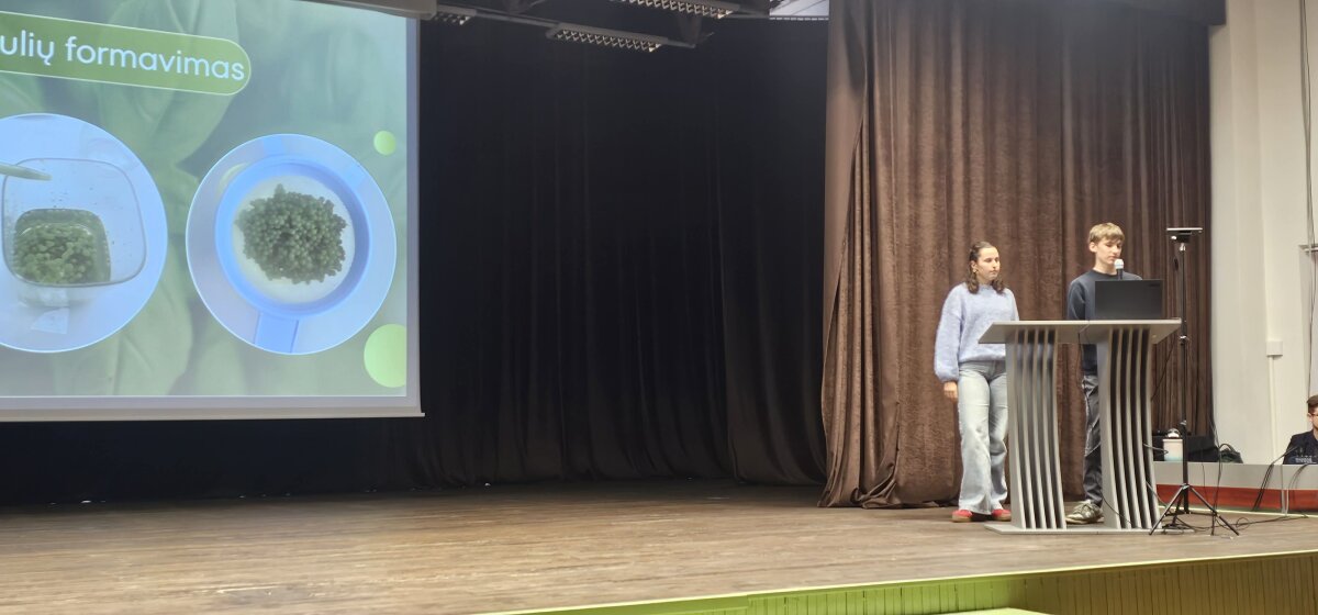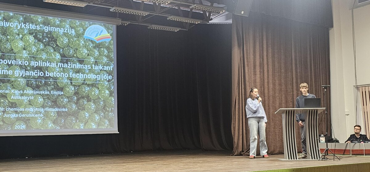 III klasės mokiniai Kajus Andrijauskas ir Emilija Auškalnytė pristatė darbą „Statybinių medžiagų poveikio aplinkai mažinimas taikant Bacillus subtilis savaime gyjančio betono technologijoje“. Šiame tyrime buvo nagrinėjama inovatyvi technologija, leidžianti betonui „savaime gyti“ – užtaisyti atsiradusius įtrūkimus naudojant bakterijas. Mokiniai analizavo, kaip Bacillus subtilis gali prisidėti prie betono ilgaamžiškumo didinimo bei statybinių medžiagų poveikio aplinkai mažinimo. Tokie sprendimai gali reikšmingai sumažinti statybų sektoriaus daromą žalą aplinkai ir prisidėti prie tvaresnės infrastruktūros kūrimo. Mokinius konsultavo chemijos mokytoja metodininkė Jurgita Gerulskienė.