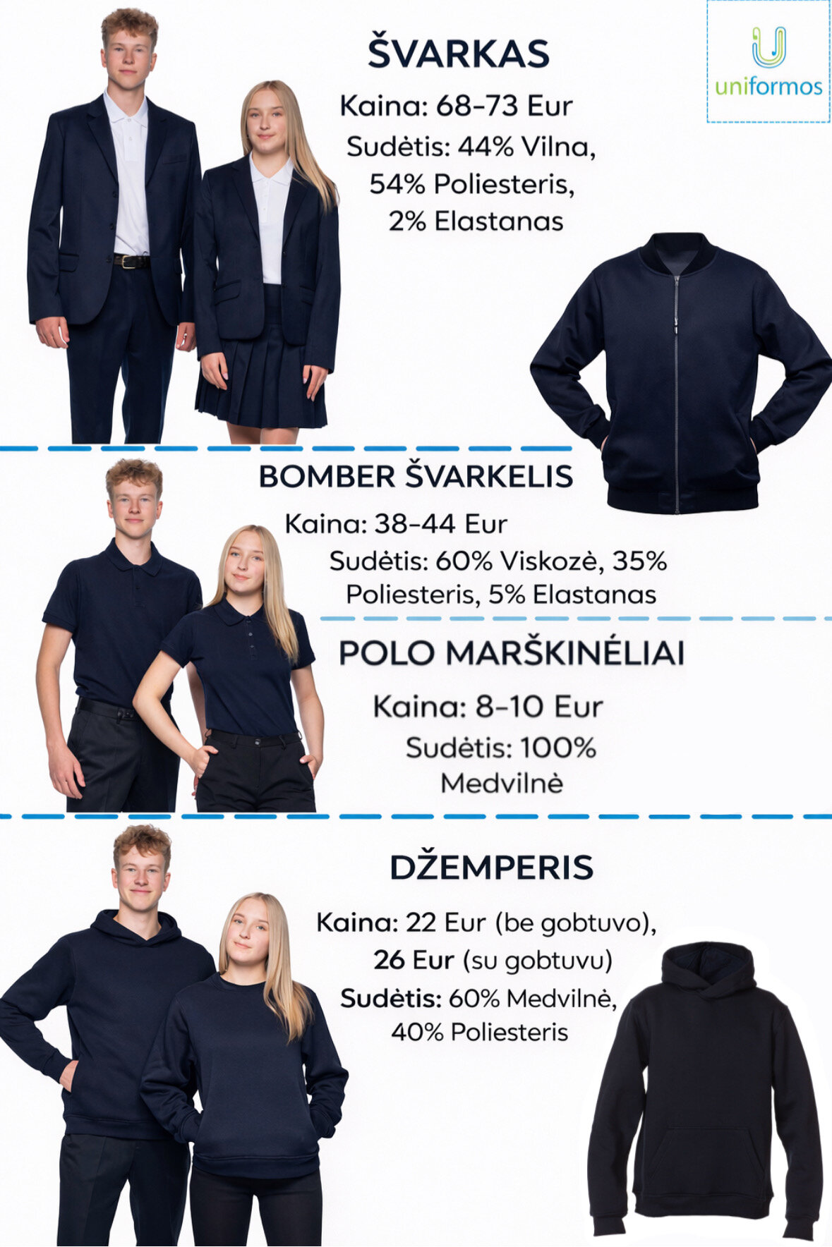 Mokyklinę uniformą galima įsigyti individualiai parduotuvėje „Uniformos” (Klaipėda, Rumpiškės g. 2, tel. +370 690 72825, El.p. klaipeda@uniformos.lt).