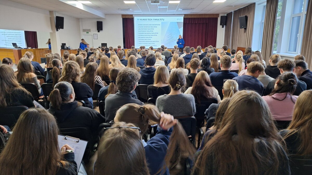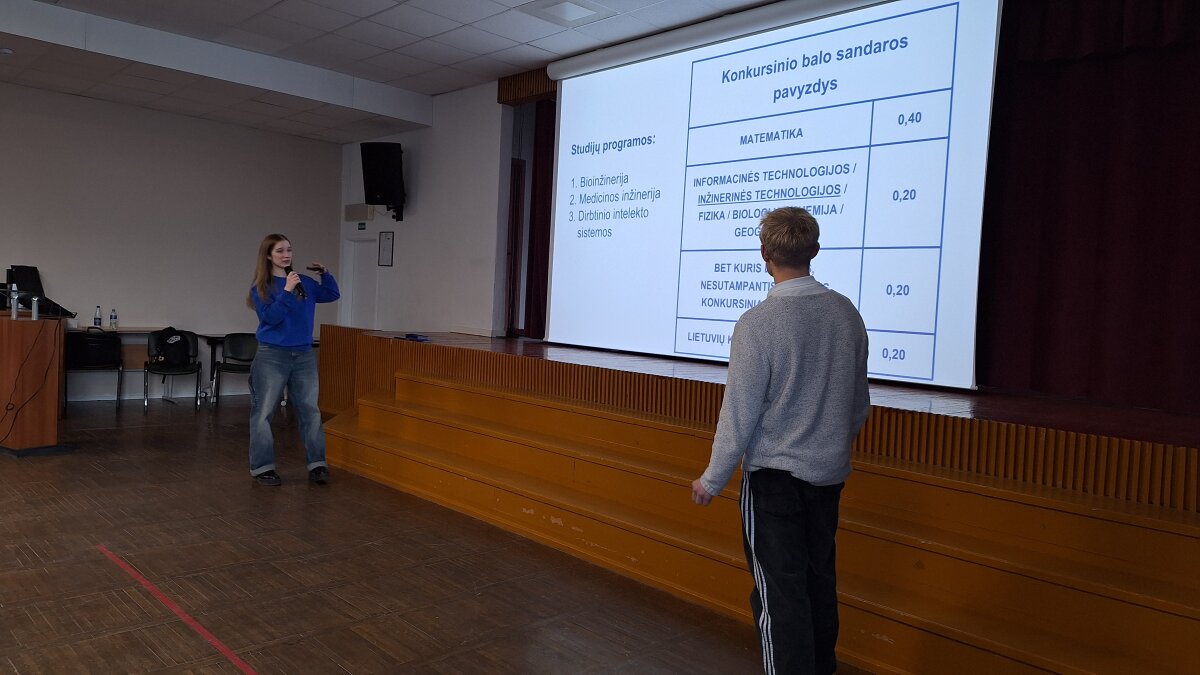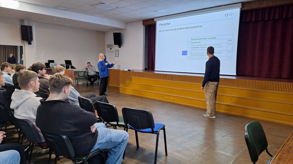 Susitikime su gimnazistais buvo aptarti stojimo reikalavimai, galimybės ir dažniausiai pasikartojančios stojančiųjų klaidos. Ypatingas dėmesys skirtas LAMA BPO prašymų pildymui – ką būtina patikrinti, kur dažniausiai klystama ir kaip teisingai susidėlioti studijų prioritetus. Po pranešimo III–IV klasių moksleiviai turėjo ne vieną klausimą VILNIUS TECH, tad drąsiai individualiai konsultavosi.